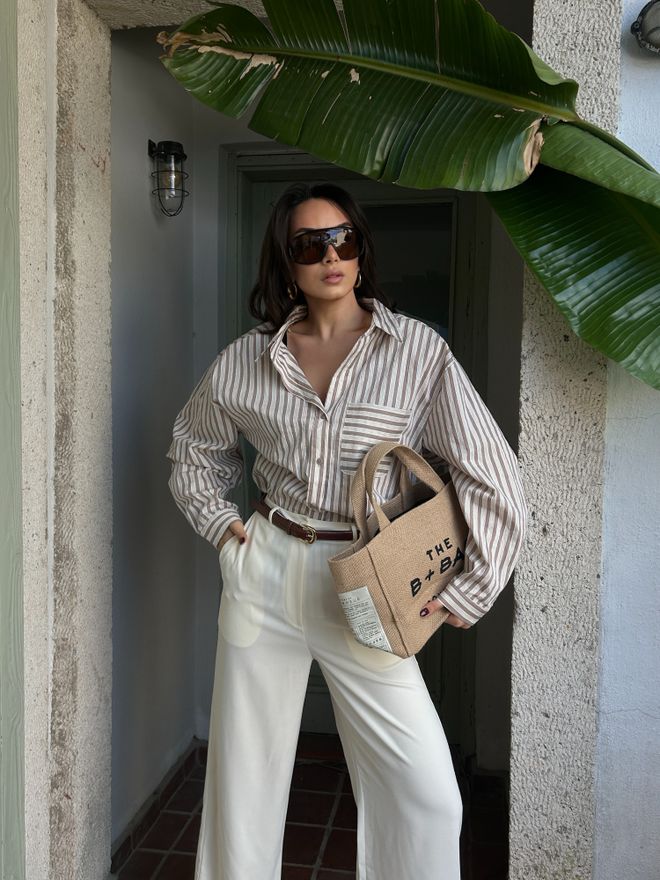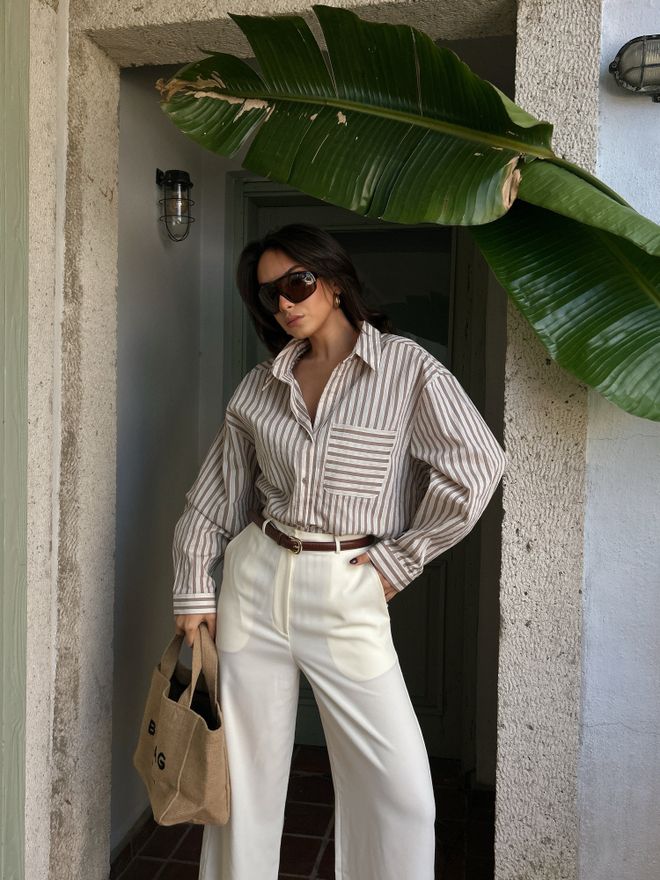 Une chemise oversize qui revisite l’intemporel avec des rayures subtiles et une coupe fluide.